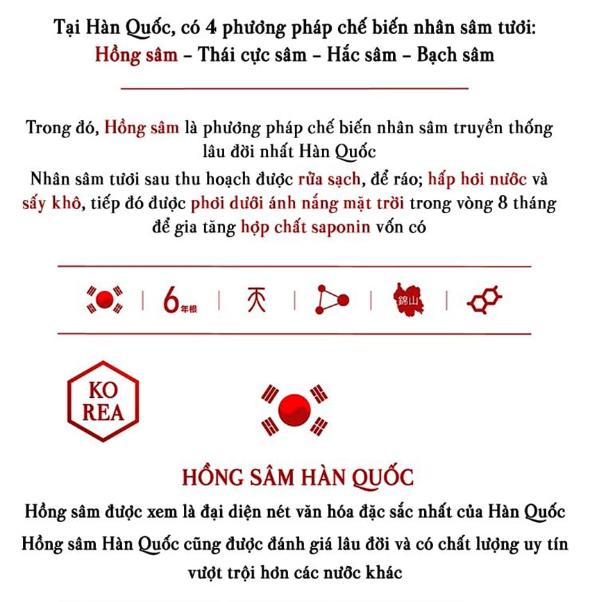 ➢ Được chế biến hoàn toàn từ những củ nhân sâm tươi chất lượng được trồng ở khu vực không bị ô nhiễm vùng Geumsan, đảm bảo chất lượng củ hồng sâm được giữ nguyên, vừa đảm bảo được hương vị.