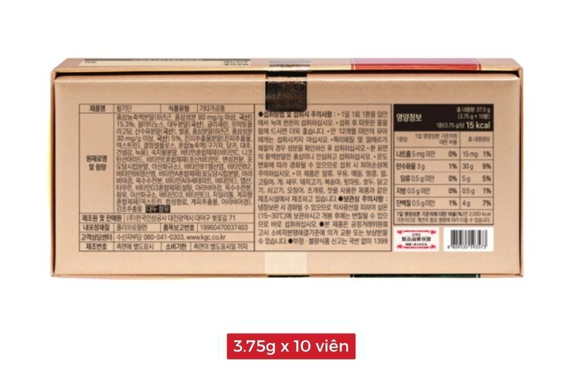 ✔ Bột hồng sâm cô đặc (6 năm tuổi, thành phần hồng sâm 80mg/g trở lên, Hàn Quốc) 15,3%, bột hồng sâm (6 năm tuổi, thành phần hồng sâm 30mg/g trở lên, Hàn Quốc) 5%, palatinose, bột đậu nành (trong nước), glycerin, fructooligosaccharides, bột dầu ngô (Hàn Quốc), mật ong, bột chiết xuất từ hạ bì (nước chiết xuất từ hạ bì, dextrin, cellulose tinh thể, hỗn hợp cô đặc (cây kỷ tử, đương quy, táo tàu, gừng khô, lộc nhung), bột địa hoàng, bột hỗn hợp vitamin (vitamin A, vitamin B1 hydrochloride, vitamin B2, vitamin B6 hydrochloride, vitamin C, vitamin D3, nicotina- mide, axit folic, vitamin E, taurine, xylitol, bột hương vị quế (ductrin, dầu quế, chiết xuất quế, gum arabic), nước chiết xuất cam thảo.