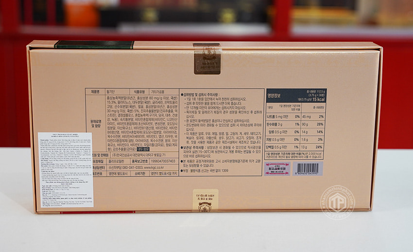 ✔ Bột hồng sâm cô đặc (6 năm tuổi, thành phần hồng sâm 80mg/g trở lên, Hàn Quốc) 15,3%, bột hồng sâm (6 năm tuổi, thành phần hồng sâm 30mg/g trở lên, Hàn Quốc) 5%, palatinose, bột đậu nành (trong nước), glycerin, fructooligosaccharides, bột dầu ngô (Hàn Quốc), mật ong, bột chiết xuất từ hạ bì (nước chiết xuất từ hạ bì, dextrin, cellulose tinh thể, hỗn hợp cô đặc (cây kỷ tử, đương quy, táo tàu, gừng khô, lộc nhung), bột địa hoàng, bột hỗn hợp vitamin (vitamin A, vitamin B1 hydrochloride, vitamin B2, vitamin B6 hydrochloride, vitamin C, vitamin D3, nicotina- mide, axit folic, vitamin E, taurine, xylitol, bột hương vị quế (ductrin, dầu quế, chiết xuất quế, gum arabic), nước chiết xuất cam thảo.